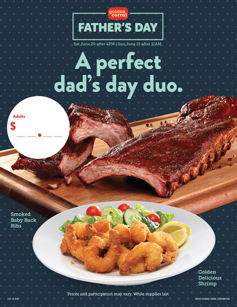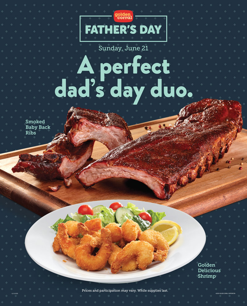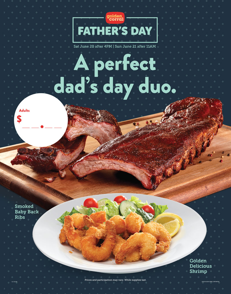 Point of purchase merchandising for Golden Corral restaurants offers a perfect Father’s Day dinner combo. The perfect duo of Smoked Baby Back Ribs and Golden Delicious Shrimp gives Dads the best of all worlds.